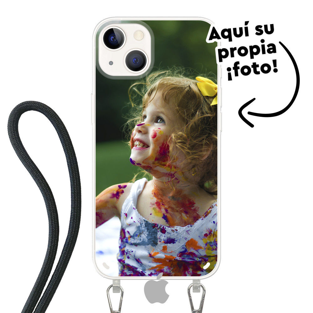 ¡Descubre la última funda para iPhone 13! Funda protectora y flexible tipo soft case iPhone con cable para llevar alrededor de tu cuerpo. Tu diseño en colores vibrantes con impresión UV.